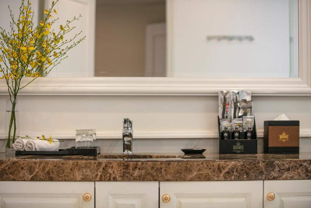 Tất cả phòng nghỉ tại Adonis Hotel được bố trí máy điều hòa, khu vực ghế ngồi, TV truyền hình cáp màn hình phẳng, két an toàn, ấm đun nước và phòng tắm riêng với vòi xịt/chậu rửa vệ sinh, dép cùng máy sấy tóc. Một số phòng có tầm nhìn ra hồ nước. Mỗi phòng đều được trang bị ga trải giường và khăn tắm.