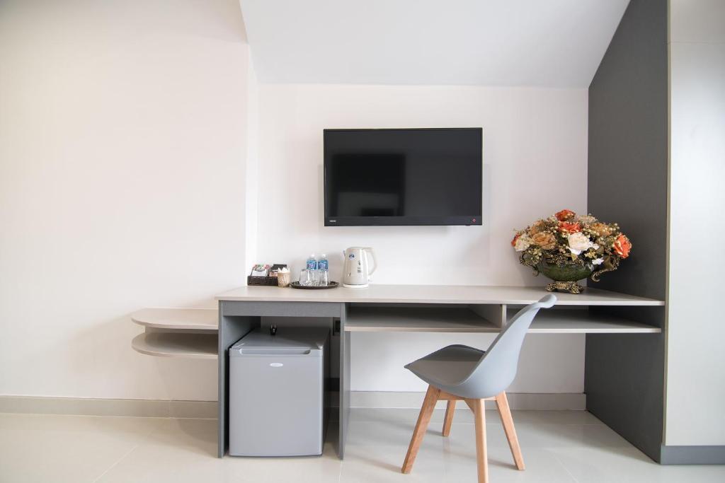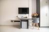Mỗi phòng của khách sạn đều được bố trí tủ để quần áo và tủ lạnh.