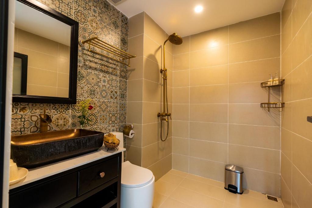 Homestay có TV màn hình phẳng cùng phòng tắm riêng với máy sấy tóc, đồ vệ sinh cá nhân miễn phí và vòi sen.